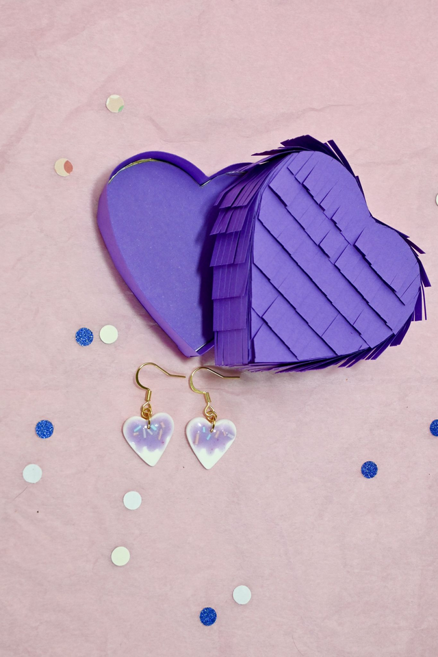 Ces boucles d'oreilles en forme de coeur sont fabriquées en pâte polymère et en résine, et viendront accompagnées d'une jolie boîte piñata en forme de coeur, créées à la main également par Noémie Glaner.