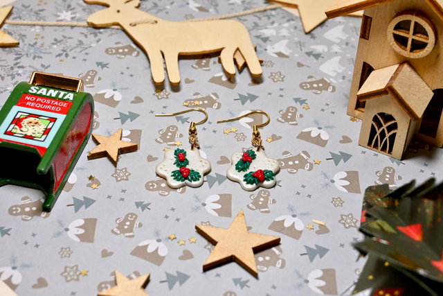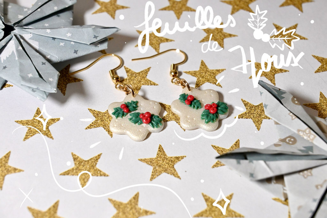 Boucles d’oreilles de Noël en pâte polymère motif houx. Elles sont composées de fleurs blanches nacrées avec des feuilles de houx sculptées.